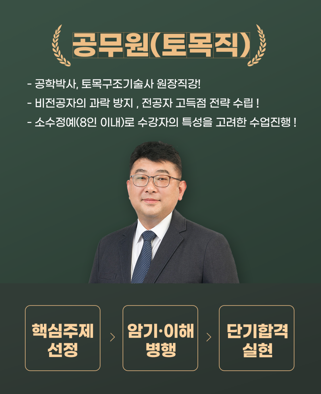 토목직 공무원 시험대비, 응용역학과 토목설계에 대한 기본이론, 기출문제풀이, 동형모의고사 등을 제공 12/ 2~4/30 (매주 화, 목, 15:00~18:00) (총 22주 과정)